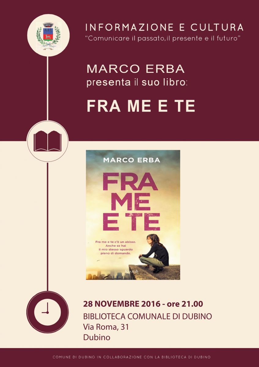 Lunedì 28 novembre , presso la nuova sede della biblioteca comunale di Dubino , Marco Erba , autore di - Fra me e te - una delle tante recensioni su amazon per presentarlo: un romanzo unico, uno spaccato , crudo, sincero sull'adolescenza dei giovani d'oggi e sui turbamenti che travolgono e sconvolgono i ragazzi. Merito di questa perfetta polaroid all'autore.